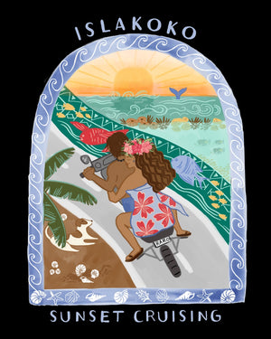 Ride into island time with our ‘Sunset Cruising’ Tee – a tribute to laidback Rarotongan evenings and local love stories on two wheels. Featuring a guy and girl gliding past the iconic Marae Moana seawall mural at golden hour, with the famous little Raro dog Pepe chilling nearby, soaking up the sunset. This oversized tee captures that dreamy Cook Islands magic – salty air, scooter rides, and the kind of tropical freedom that lingers long after the sun dips below the horizon.